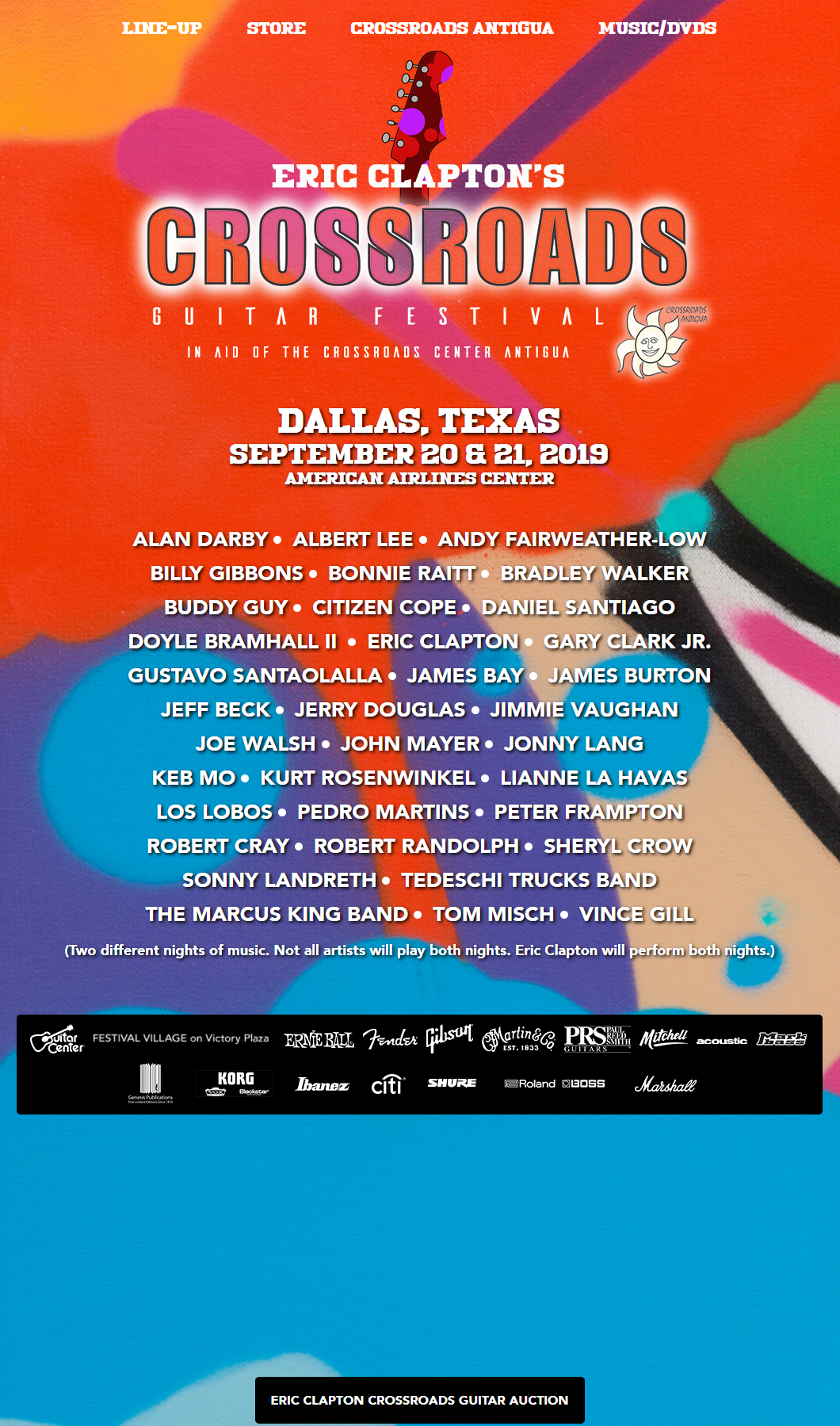 为给安提瓜岛十字路口戒毒中心筹款,EricClapton于2004年开始举办Crossroads Guitar Festival,到2019年已是第五届。Crossroads Guitar Festival已成为全球知名吉他演奏家、吉他大师表演的璀璨舞台。