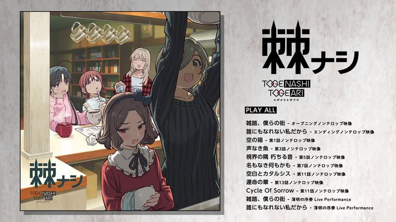 加えてTVアニメ放送前の2024年3月にリアルにて開催されたトゲナシトゲアリ 1st ONE-MAN LIVE “薄明の序奏”より、オープニング主題歌「雑踏、僕らの街」とエンディング主題歌「誰にもなれない私だから」の2曲のLIVE映像も初めて収録される。