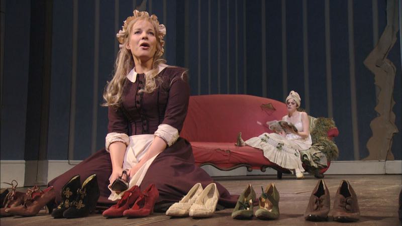 开幕时,在没落贵族马尼菲柯男爵破败的府邸厅堂里,早晨,男爵还在睡懒觉,他的两个刁蛮、自私的亲生女儿正在搔首弄姿,而他的继女安杰林娜则蓬头粗服地坐在炉旁,一面干活一面唱出她淳朴的心愿:“从前有一位厌倦了独身生活的国王…”安杰林娜的母亲是一位富有的寡妇,带着女儿安杰林娜嫁给了丧偶的男爵,男爵挥霍光了寡妇的家产,寡妇也因病身亡,安杰林娜在男爵家也受到了苛待,整天干活儿使得她蓬首垢面,被叫做灰姑娘。她以天鹅绒般地女低音唱着自己淳朴的心愿时,两个姐姐便用尖利的高音模仿、嘲笑她。这时,一位老乞丐来到门前请求施舍遭到了姐姐们的责骂,而善良的安杰林娜却偷偷地拿了一点面包和咖啡给他。老乞丐实际上是拉米罗王子的老师阿利多罗,由于王子不愿意遵循封建的父母之命媒妁之言来结婚,他便装扮成乞丐到民间走访为王子物色未婚妻。安杰林娜的善良、美丽给了他很深刻的印象。与此同时,皇室宣布了即将举行一次盛大的舞会,邀请城中所有的贵族家庭的少女参加,希望王子能够从中选到中意的伴侣。为了考验来赴会的少女们,王子又出新招,让侍从丹迪尼假扮自己,而自己却穿上侍从的制服站在一旁,这样自己便可以从容地观察和挑选未婚妻了。听到消息,男爵家里立刻乱成一团;两个姐姐赶紧梳妆打扮,将安杰林娜支使得团团转,刚刚做了一个好梦醒来的男爵得知有此好事,以为正是鸿运当头的预兆,便幻想着如果女儿被选,自己作了“国丈”,不仅风光十足,也可以重振败落的家业…,这是一段典型的意大利喜剧男低音的唱段,只有唱、做俱佳的演员方能胜任。扮做侍从的王子来“打前站”和安杰林娜不期而遇,吓得她摔碎了手中的杯盘,但是她眼睛里闪耀着的温柔、甜蜜的光辉使他动心,当王子问她是何人,她的回答却让王子糊涂了:“我父亲不是我的父亲,姐妹也不是亲生,我妈妈是一位寡妇,可是她仍算是那两个的母亲…”在这里,罗西尼显示了他的以音乐描绘角色心理的高度本领。亲自上门邀请的假王子驾到,男爵一家卑躬屈膝丑态百出地迎接,而安杰林娜却躲藏不见踪影。假王子丹迪尼神采飞扬地唱了一曲“我象一只春天的蜜蜂飞来飞去…”,浑厚的男中音却大耍花腔,充分显示了意大利“美歌”(Bel canto)技巧的魅力。男爵一家受宠若惊地接受了邀请,安杰林娜也恳求一同前去却遭到男爵粗暴地拒绝,阿利多罗出来打抱不平,拿来户口本问道:“男爵有三个女儿,那另一个在哪里?”男爵假装流泪说:“死了!”他带着两个亲生的女儿去赴舞会了,只有安杰林娜孤另另地留在家里。原来化装成老乞丐的阿利多罗来帮助她了,他高歌一曲“在崇高深邃的天堂…”,这首庄严的咏叹调宣布她的命运即将奇迹般地改变,他还召来了马车,为她准备了华丽的衣服和首饰,让她打扮得象一位公主似地去参加舞会了。
