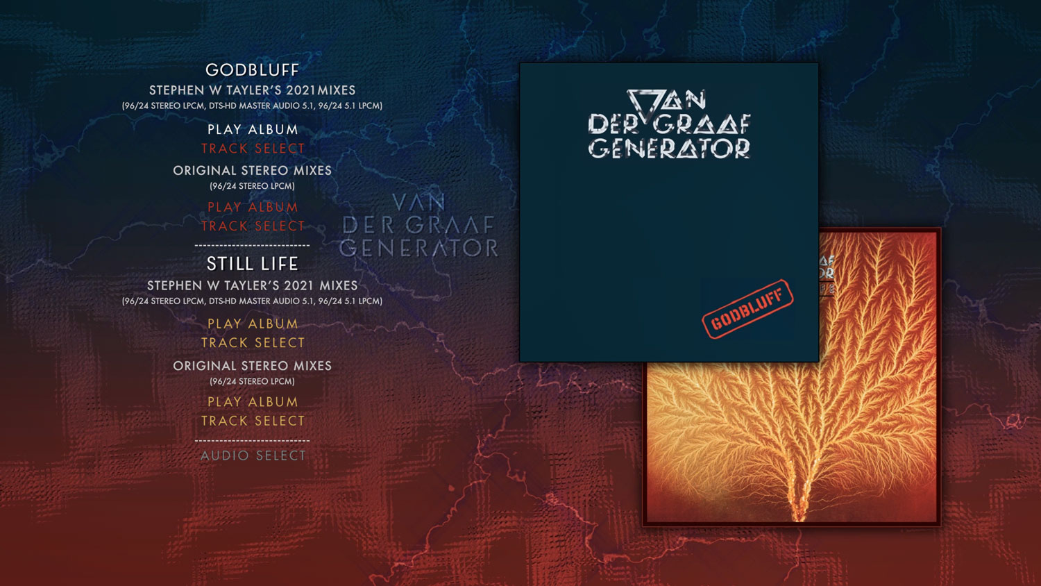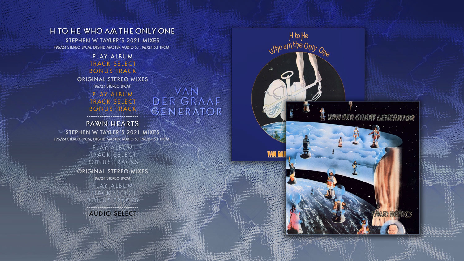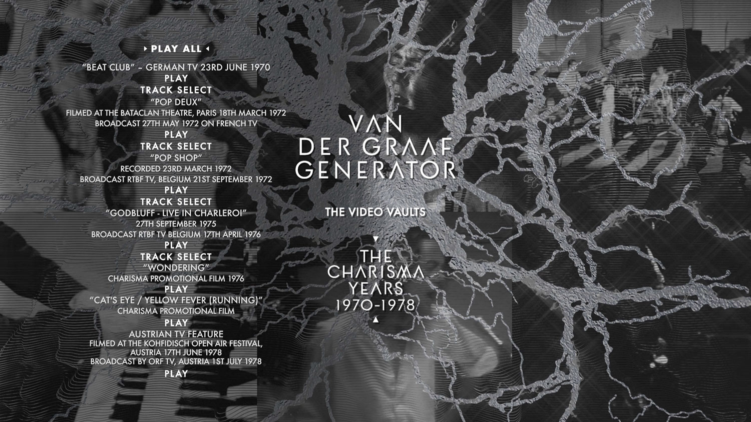 The albums “H to He Who Am the Only One”, “Pawn Hearts”, “Godbluff” and “Still Life” have been stunningly remixed from the original multi-track tapes in both stereo and 5.1 surround sound by Stephen W Tayler. These feature on 4 additional CDs and two Blu ray discs. Also featured are two CDs of a recently discovered and previously unreleased entire concert recorded in Paris in December 1976 by French radio and all of the surviving BBC sessions recorded by the band. In addition there is a Blu ray disc featuring all of the surviving VdGG television footage and promotional films including their appearance on German TV’s “Beat Club” in 1970, their filmed appearance at The Bataclan in Paris in 1972 for the French TV show “Pop Deux”, the 1972 appearance on “Pop Shop” for RTBF Belgium, a live performance shot by Belgian TV in Chaleroi in September 1975, the promotional films of “Wondering” and “Cat’s Eye”, and a 20 minute documentary with live footage shot by Austrian television at The Kohfidisch Open Air Festival, Austria in June 1978.