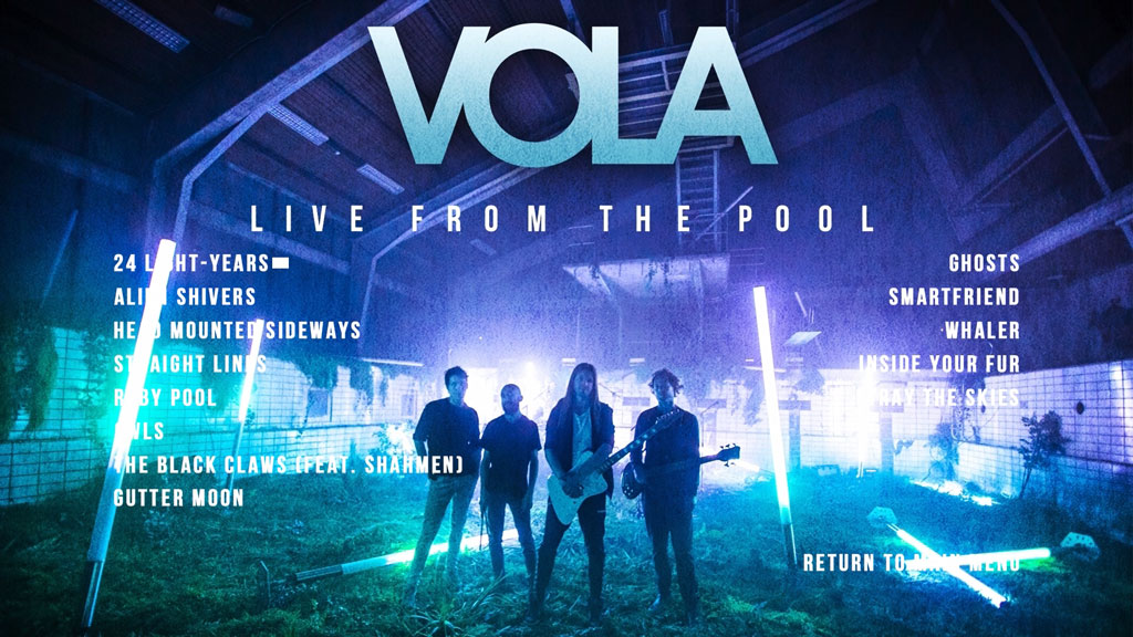 In September 2021, VOLA performed an intimate show in a stunning live setting. ‘Live From The Pool’ took place at the swimming pool of the abandoned Auderød military camp in North Zealand near Copenhagen, Denmark. Designed by the world-famous architect Henning Larsen this defunct building has become part of the Auderød nature park. A place where nature encounters the mysteries of a once existing military base, ready to be explored.