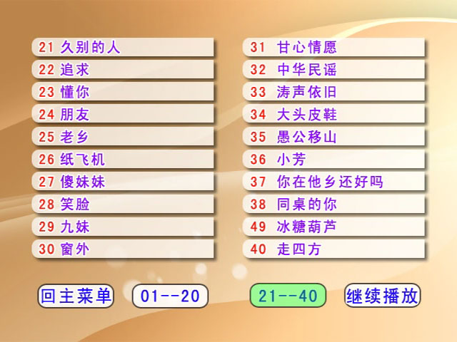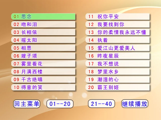 整碟40首原版卡拉OK版MV,基本为80-90年代卡拉OK必点歌曲,卡拉OK精校字幕,原声音轨2条分别为AC-3和DTS,1条AC3伴奏音轨,免费分享欣赏给大家充实大家的家庭小曲库,下附歌曲目录详细列表。