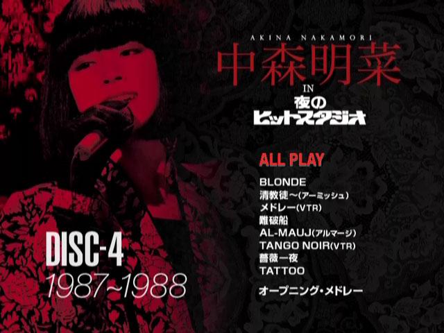 中森明菜をスーパースターへと押し上げた伝説的音楽番組 フジテレビ 「中森明菜 in 夜のヒットスタジオ」 DVD化 ! 大ヒット曲 「DESIRE-情熱-」 「TATOO」 「難破船」 を始めとして歌謡史に残る伝説のパフォーマンスを披露した“歌姫”中森の貴重な映像を8時間にわたり収録した完全保存版。 出演の度に話題になる衣装、シングルB面曲やアルバム収録曲、恒例のオープニング・メドレーの歌唱シーンも収録! 数々の賞に輝いた1984~1988年のFNS歌謡祭の貴重な映像をダイジェストで収録。 1982年「少女A」での初出演から1995年「’95夜のヒットスタジオ超X’masスペシャル」までの出演シーンから貴重な映像を収録。
