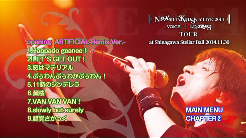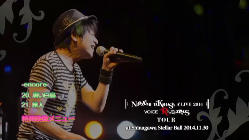 Singer/seiyuu/actor Naozumi Takahashi’s 16th live DVD, features his VOICE RENDEZVOUS tour final, held at Shinagawa Stellar Ball on November 30, 2014. Peaked at #7 on the Oricon Music DVD chart.
