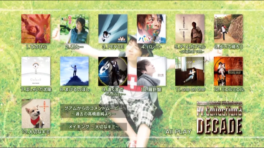 This collection picks up where his 5th anniversary one left off, compiling all his music videos from 2007 until the release of this one in 2012. Also includes a bonus commentary vid. originally recorded by Naozumi back in 2007, during his trip to Guam for PV filming, plus a making-of video for “Taisetsu na Kimi”, featuring his cat, Choro.