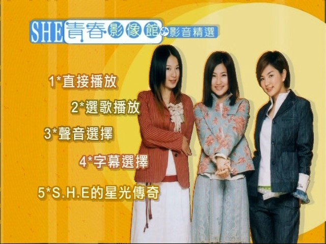 一次完整拥有S.H.E星光闪耀影音纪录最精选!收录台湾首席女声团体∼S.H.E 1st Album「女生宿舍」及2nd Album「青春株式会社」两张专辑之14首音乐录影带,可看、可听、可唱、原声原影、音声多重卡拉OK!