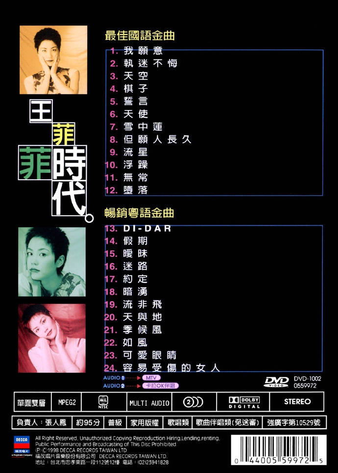 由福茂唱片音乐股份有限公司于1998年发行的菲时代24首国粤语金曲一次完整收录王菲的多首代表作品包括”我愿意”,”天空”,”但愿人长久”等歌曲。