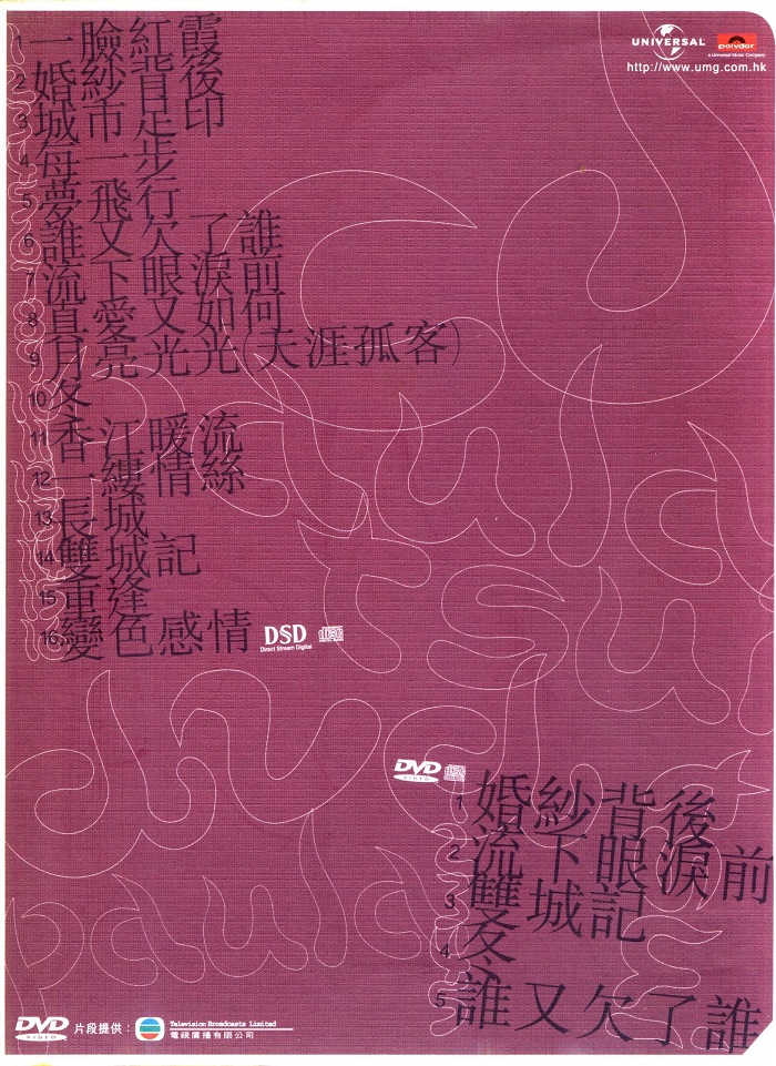 環球DSD視聽之王系列精選了粵語歌曲黃金時代的十幾位元代表歌手的經典作品,用DSD技術重新編碼壓制,並附送一張音樂錄影DVD,非常值得珍藏。