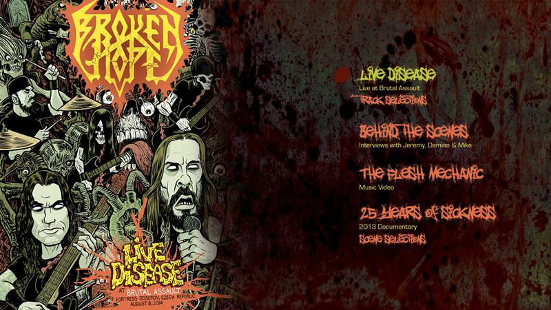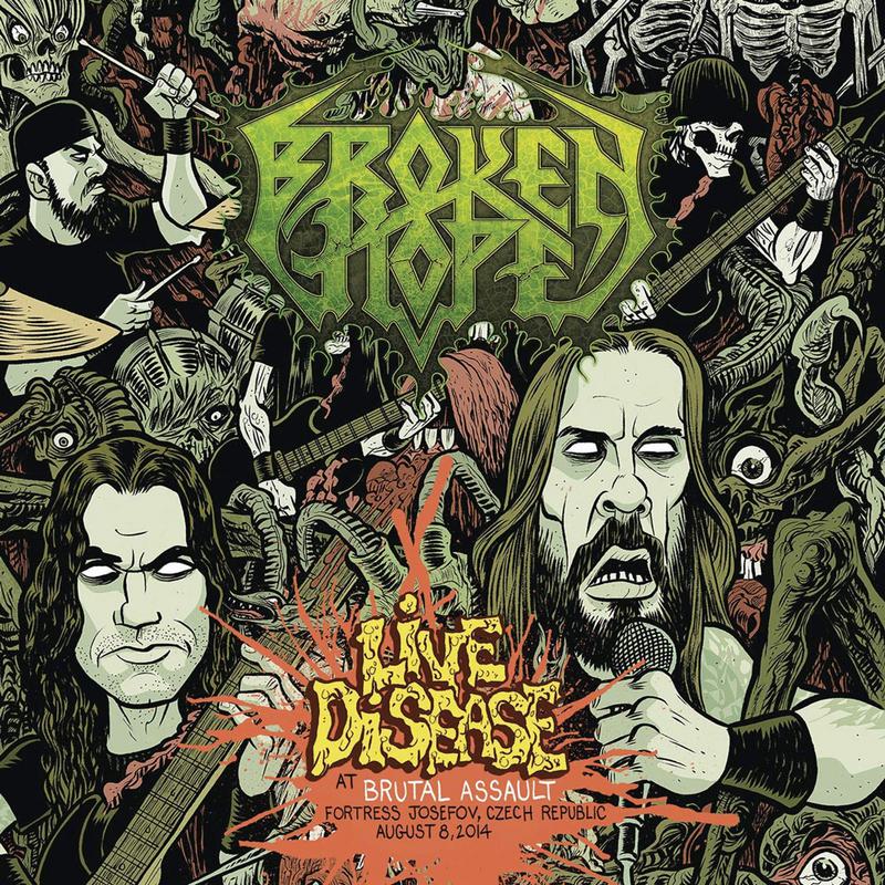 It’s been 24 years since Chicago’s death metal favorites Broken Hope released their Swamped in Goredebut disc, and fans are about to get the first-ever concert DVD and live album from the group. The disc is titled Live Disease at Brutal Assault and was filmed at the Brutal Assault festival in the Czech Republic in August 2014. The festival brought in over 20,000 fans and those catching Broken Hope’s performance definitely showed their love for the group. Director Tommy Jones gives fans a look at the band’s performance via a dozen pro cameras and the packaging includes some striking exterior and interior artwork from metal art master Mark Rudolph. Get a closer look at what fans can expect via the DVD trailer posted above. Guitarist and founding member Jeremy Wagner says, “Playing Brutal Assault in 2014 was a dream come true. Being one of the Main Stage acts at the fest in front of those thousands of insane fans was also a huge dream come true. And then … above all that … we had this epic moment captured by a pro video crew and also recorded by the best soundman in the biz, and it made for a perfect storm that enabled us to put it together to share with metal fans the world over to enjoy forever!” He adds, “We couldn’t have done all this without the mega-talent of Tommy Jones … Tommy took a million pieces of footage and numerous audio files, pieced them all together, aligned everything, edited it all, and made for us (and the world), an absolutely stunning concert DVD! We even added the Broken Hope Documentary-Film, 25 YEARS of SICKNESS — The History of Broken Hope to this Blu-Ray! This film was released only in North America with Omen of Disease … now the entire world will have this amazing film-and in a Hi-Def Blu-Ray format! Last thing I wanna say is: the skills of Thilo Fehlinger, Scott Creekmore and Chris Wisco made our first-ever Live Album a loud, clear, and sonically-bombarding tour-de-force! This entire DVD/CD package is a monumental feather in our cap!” Director Tommy Jones adds, “This Broken Hope project has come out so sick! It has the quality and look of a high-end and polished commercial piece, but as a completely brutal, death metal concert experience. Definitely one of the coolest looking live pieces I have been able to work on in the death metal genre. Really happy with how it all came together.”