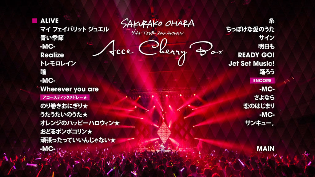 大原櫻子の「4th TOUR 2017 AUTUMN ~ACCECHERRY BOX~」からZepp Tokyo公演を映像化。「ALIVE」「マイ フェバリット ジュエル」「青い季節」「トレモロレイン」「ちっぽけな愛のうた」ほかを収録。特典映像を収めた初回版。