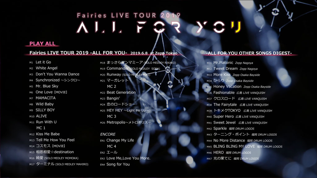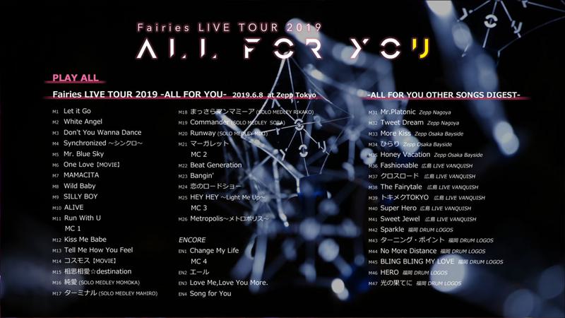 2019年6月~7月に開催されたフェアリーズ全国ツアー『フェアリーズ LIVE TOUR 2019-ALL FOR YOU-』より、6月8日にZepp TOKYOで開催された東京公演の模様を完全収録!各地の公演でのみ披露された楽曲をダイジェスト収録した特典映像も収録。