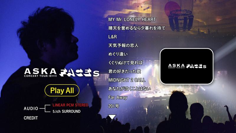 Live Blu-ray release from ASKA featuring his performance “ASKA CONCERT TOUR 10>>11 FACEs” at Nippon Budokan on January 26, 2011. Contains standard numbers of Chage and Aska, and more for 19 songs total.
